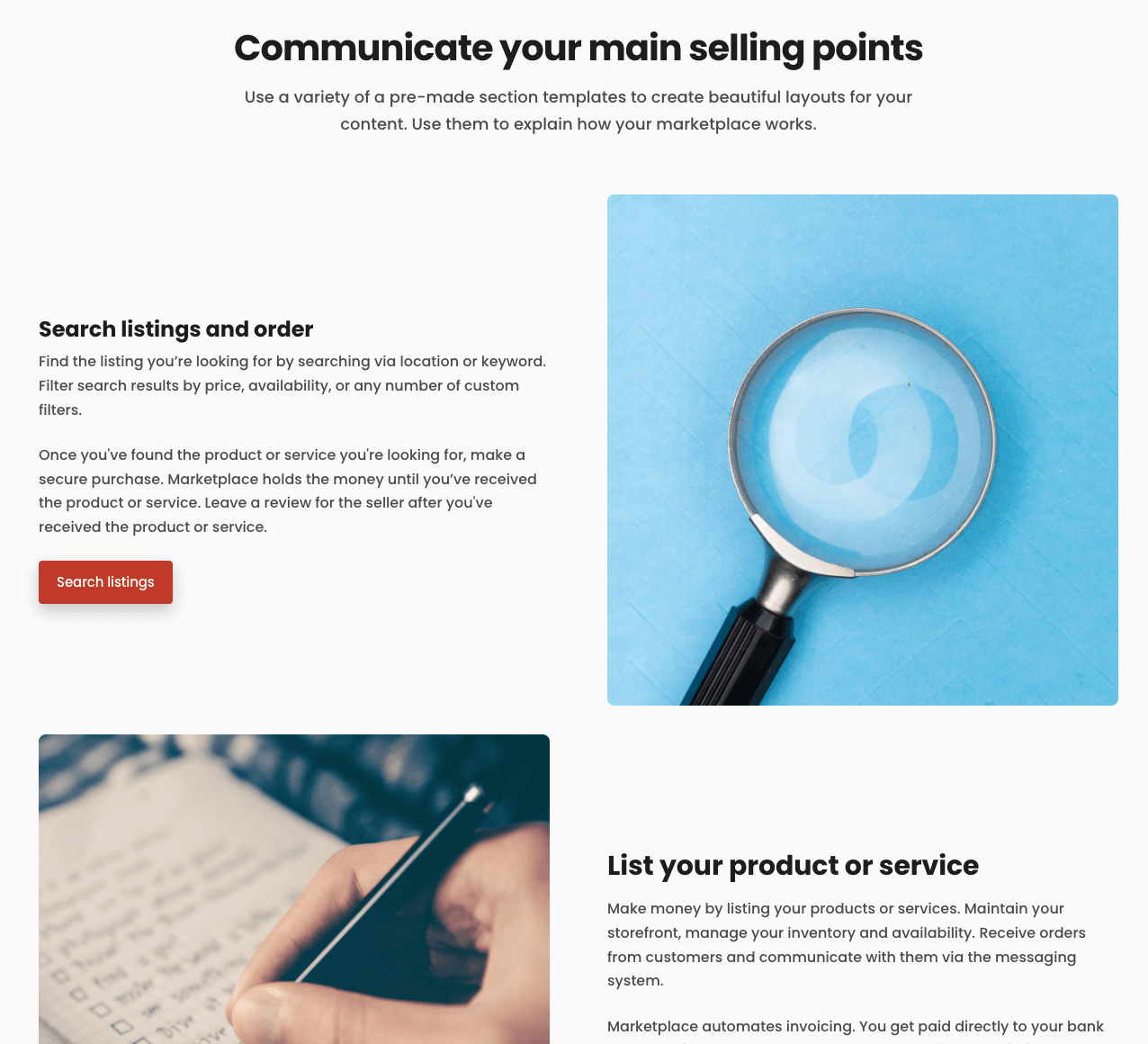 Features sections, by default, show blocks of visual and text content. The block contents are on a single row, alternating the order, and different blocks are in a single column. As with all content sections, the designer of your website can make changes as to how exactly the blocks get displayed on the page.