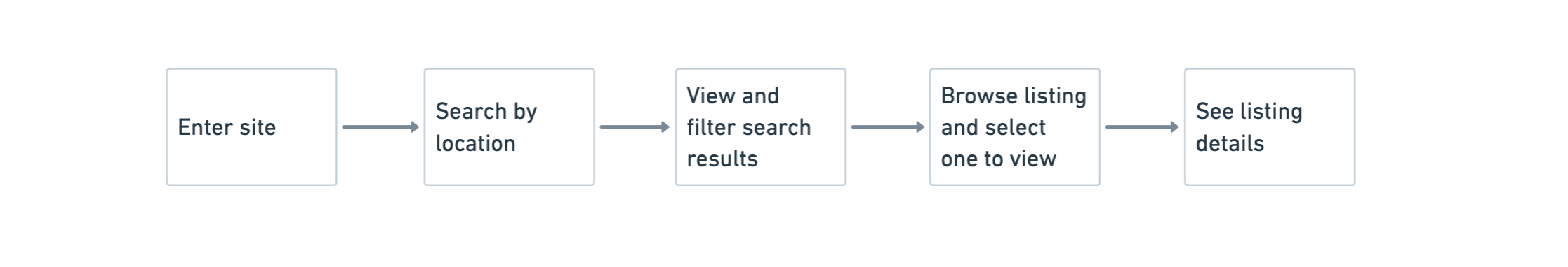 The discovery journey depicts how users search and find listings in your marketplace. Starting on the landing page, users progressively narrow their search to find the service, rental, or product they need. Users might find what they need by searching nearby locations or via keywords. Results should be filtered by relevant criteria, like price or category.