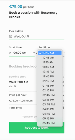 Sometimes, there are cases where you want to have a basic length for a booking and then different lengths for subsequent time slots. For instance, a listing could feature 75 minute private yoga class with the option to extend it for 30 minutes at a time. In those cases, you need to create different handling for the first time slot, i.e. the first start and end boundaries.