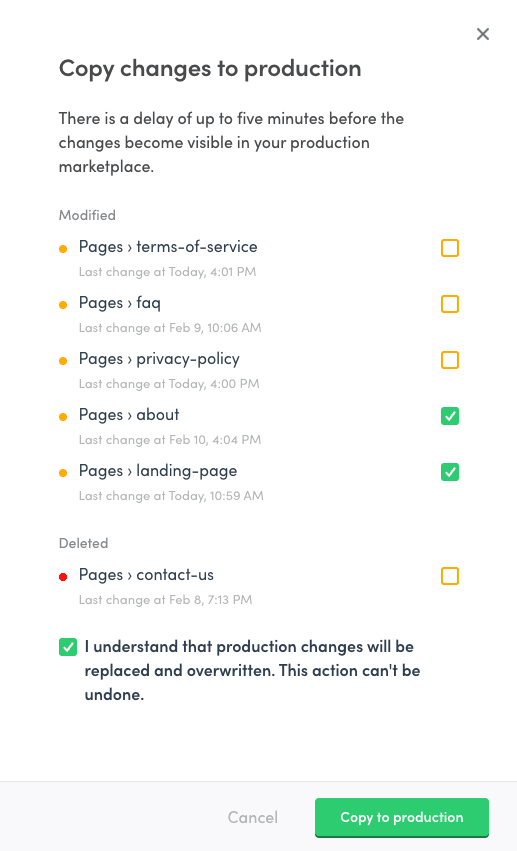 copy-to-production You can select what changes you copy to Live. Only selected changes copy to Live. The changes you copy to Live overwrite your pages content there.