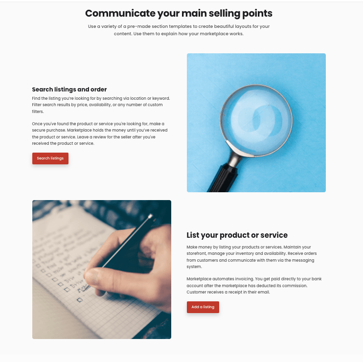 Features sections are highly visual. This example encourages buyers to find listings and sellers to create them. Each row is a unique Block. Both Blocks include an image, title, text, and call to action button. This layout alternates where media and text information appear.